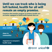 WHO and UNICEF are jointly releasing the landmark Primary health care monitoring framework and indicators monitoring health systems through a primary health care lens, the first-ever globally normative and endorsed primary health care measurement and monitoring framework, and the official measurement framework in support of the Declaration of Astana and Operational Framework for PHC. As countries strive to reorient their health systems around the principles of primary health care, this Framework responds to Member States’ request to monitor primary health care performance to accelerate progress towards universal health coverage and the other health-related Sustainable Development Goals.