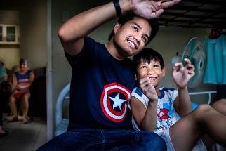 Vhal plays with his 8-year old son, Raigel Haythan, in their home in Mandaluyong.