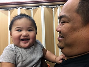 Khayri smiles while being carried by her father Julius.