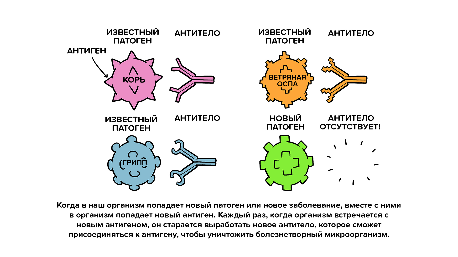 Антитела можно считать солдатами в защитной системе организма. Каждое антитело — как солдат — обучено распознавать один конкретный антиген. В организме человека присутствуют тысячи различных антител. Когда организм впервые подвергается воздействию какого-либо антигена, требуется время, чтобы иммунная система отреагировала и выработала антитела, специфические для этого антигена.