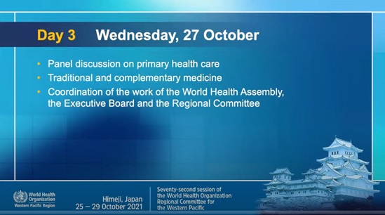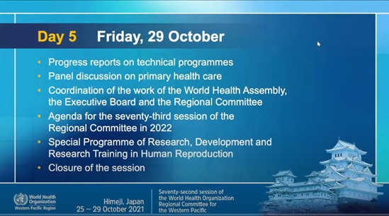 The seventy-second session of the World Health Organization Regional Committee for the Western Pacific was held in Himeji, Japan from 25 to 29 October 2021.